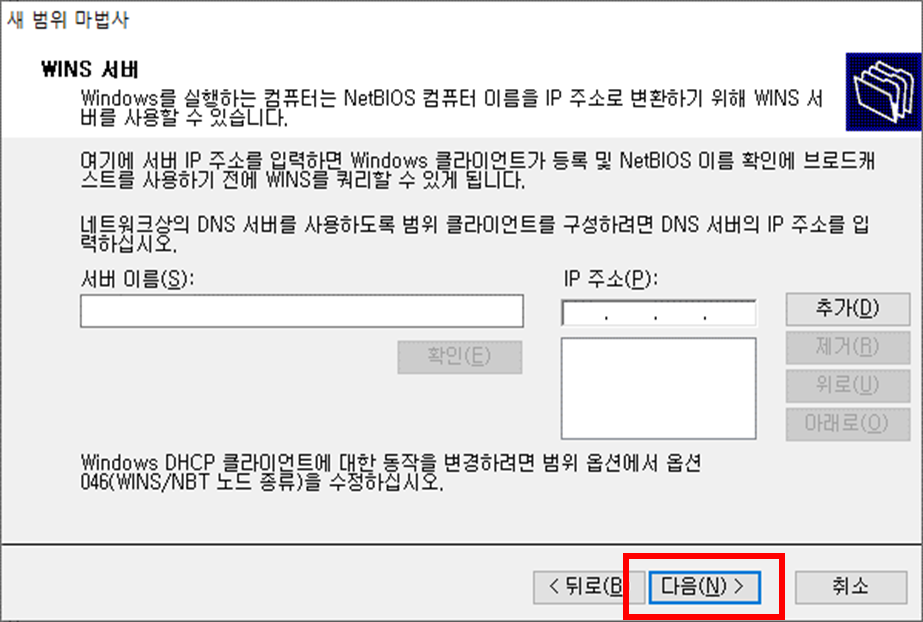 'DHCP 서버 구성 설정' 끝 IP 주소(E) > 제시문제의 분배할 주소범위 끝