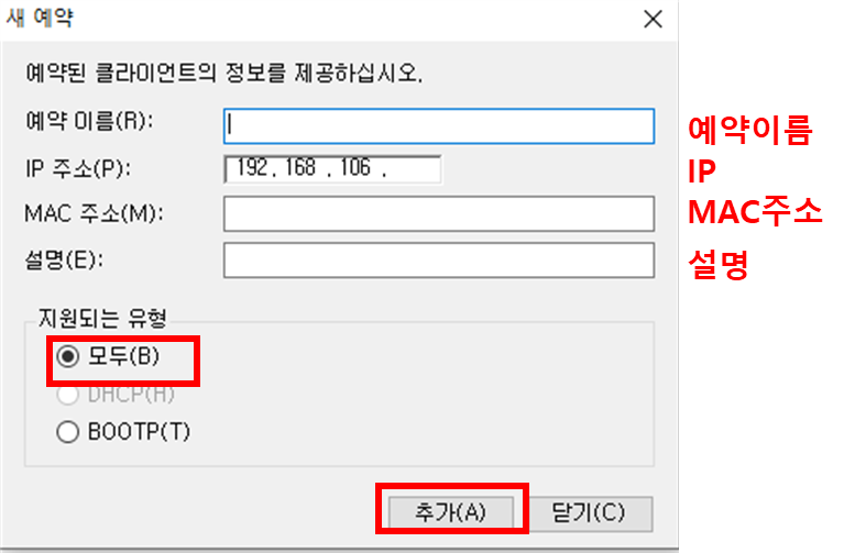 IP 주소(P)에 제시된 예약설정의 IP